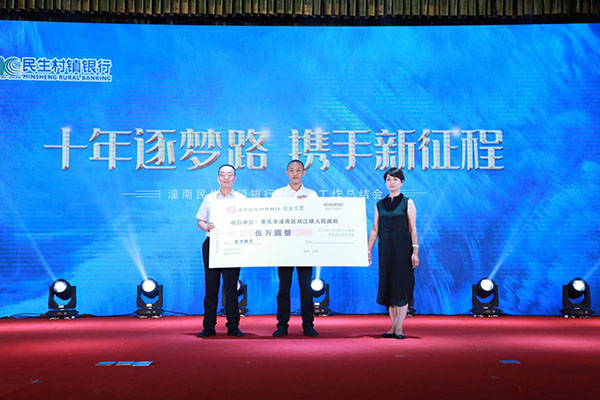 潼南民生村鎮(zhèn)銀行向潼南區(qū)雙江鎮(zhèn)人民政府捐款。民生銀行重慶分行供圖