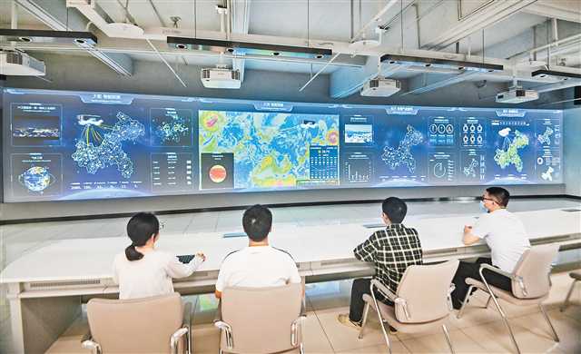 八月十二日,重慶市氣象局,工作人員在“四天”智慧氣象系統(tǒng)前查看天氣數(shù)據(jù)。首席記者 龍帆 攝\視覺重慶