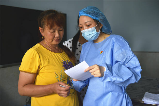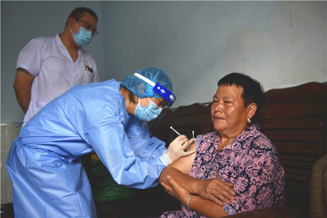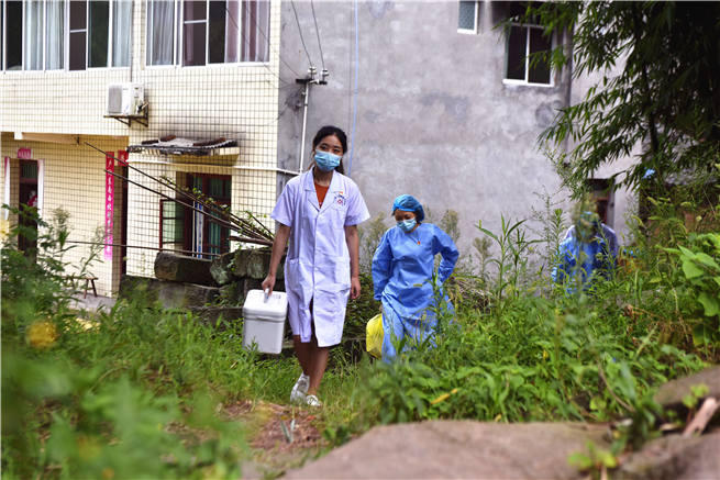 在三江街道龍?zhí)链,?dāng)?shù)厣鐓^(qū)衛(wèi)生服中心的醫(yī)務(wù)人員挨家挨戶(hù)為村民宣傳和疫苗接種。