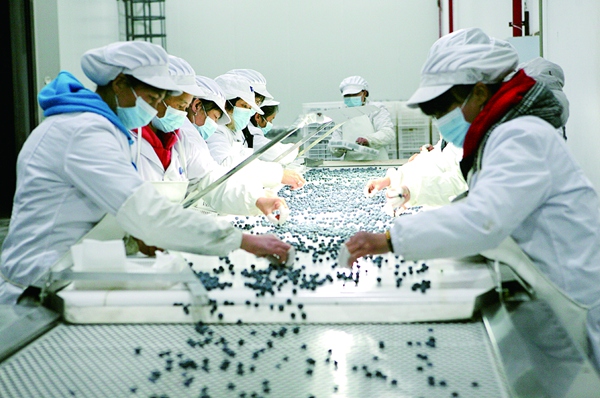 工人在生產(chǎn)線上分揀藍莓。黎明攝