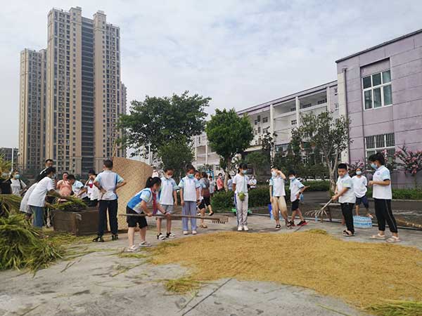 收割完成后,大家忙著打谷子和曬谷子 江津區(qū)教委供圖