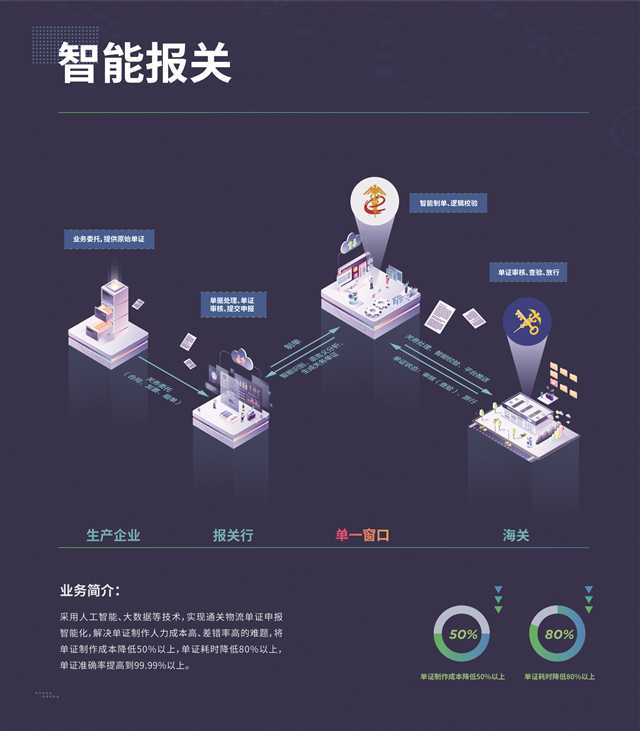 以“智能報關(guān)”為例。重慶“單一窗口”在全國首次引入RPA流程自動化機(jī)器人,單證處理時間由每票40分鐘縮短到40秒,單證效率提高80%以上,單證成本降低50%以上。