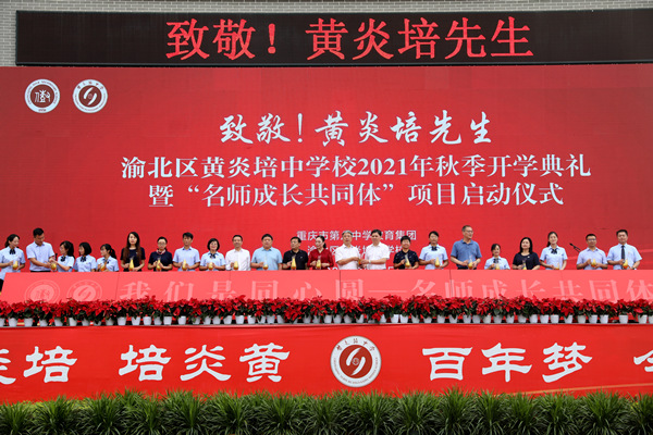 活動中,師生家長與嘉賓共同觀看了短片《黃炎培,培炎黃,百年夢,今啟航》,現(xiàn)場舉行了“我們是同心圓-名師成長共同體”項目啟動儀式。隨后,重慶八中、黃炎培中學行政及兩校教研組長共同上臺,流金主題詞,并向校園內(nèi)黃炎培先生塑像致敬獻花。