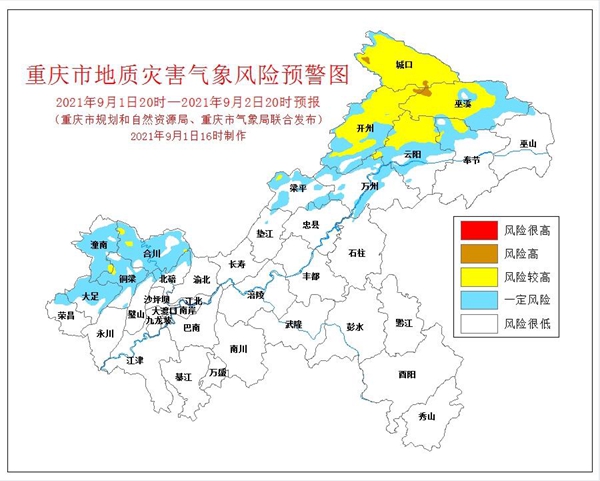 9月1日20時至9月2日20時,城口縣、巫溪縣、開州區(qū)屬于高風險地區(qū),地質(zhì)災(zāi)害氣象風險等級為二級(橙色預(yù)警),云陽縣、奉節(jié)縣、梁平區(qū)、萬州區(qū)、合川區(qū)、潼南區(qū)、銅梁區(qū)屬于風險較高地區(qū),地質(zhì)災(zāi)害氣象風險等級為三級(黃色預(yù)警),大足區(qū)、北碚區(qū)、渝北區(qū)、巫山縣、墊江縣、榮昌區(qū)、璧山區(qū)、石柱縣、忠縣屬于一定風險地區(qū),地質(zhì)災(zāi)害氣象風險等級為四級(藍色預(yù)警),請相關(guān)區(qū)縣注意防范。(胡虹、劉敏)