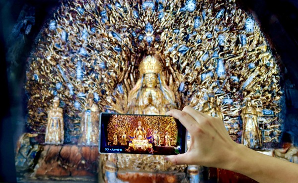 該項(xiàng)目首先在大足石刻成功實(shí)施,通過覆蓋于景區(qū)的5G網(wǎng)絡(luò),將手機(jī)對著千手觀音佛像修復(fù)前原貌識別圖,可用AR技術(shù)體驗(yàn)到千手觀音佛像整個修復(fù)過程,將博物館文物展品背后的文化內(nèi)涵以手持終端+數(shù)字內(nèi)容的形式呈現(xiàn)給觀眾。