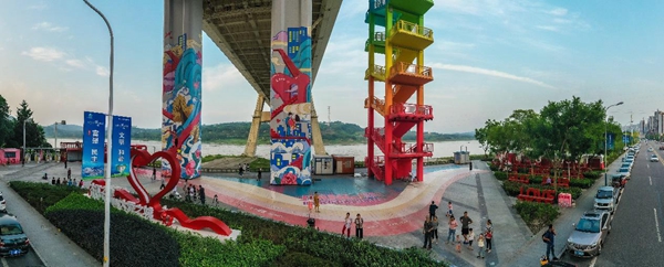愛情文化長(zhǎng)廊充分利用生態(tài)景觀游線將愛情文化的元素串聯(lián)到整個(gè)長(zhǎng)廊中,以“大江之津 大愛之城”為主題,以長(zhǎng)江濱水帶為脈絡(luò),對(duì)橋墩、樓梯、綠化等環(huán)境進(jìn)行了微改造。