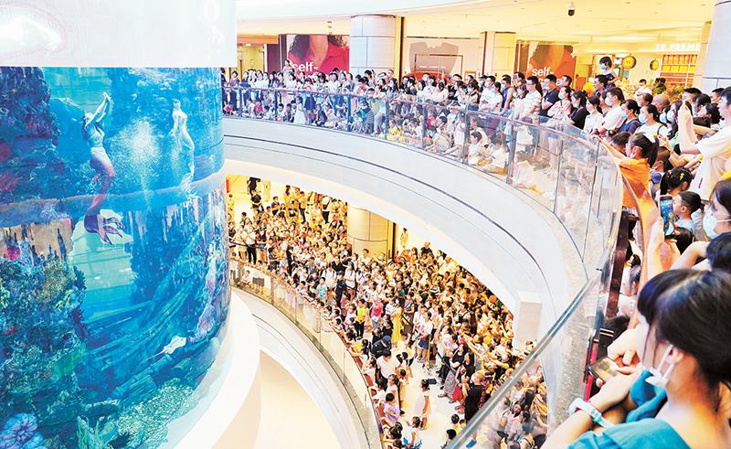 9月5日,江北區(qū)觀音橋星光68廣場B區(qū),市民觀賞全景柱狀海洋館內(nèi)的美人魚表演。
