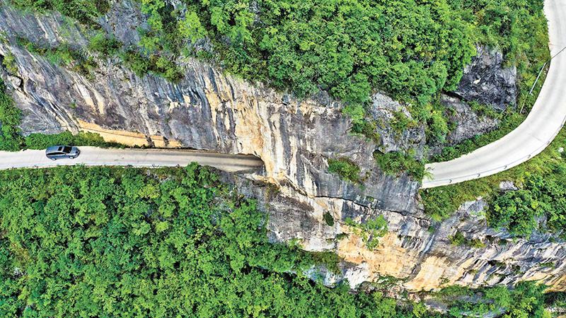 9月7日,在酉陽銅鼓鎮(zhèn)江東峽拍攝的掛壁公路。