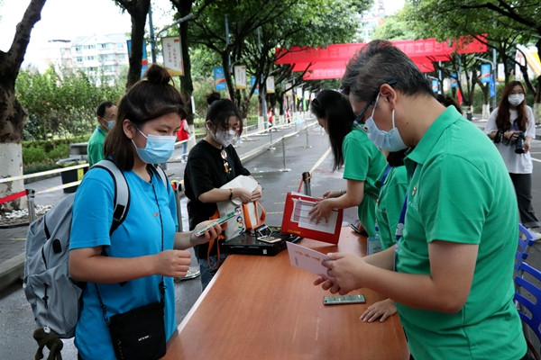 這道風(fēng)景線所串聯(lián)起來的,正是為新生進(jìn)校生命健康保駕護(hù)航所設(shè)置的三重安全防護(hù)關(guān)口。第一道關(guān)口是身份核驗(yàn),黨員教師志愿者們在入校處逐一核驗(yàn)新生的錄取通知書和行程碼,只有持有本人錄取通知書且行程碼為綠碼的新生,才可正常通行。一旦行程碼異常,志愿者們就會立即安排新生到臨時觀測區(qū)等候,核實(shí)該生的旅居史、健康史、接觸史,按當(dāng)前國內(nèi)重點(diǎn)地區(qū)來(返)渝人員健康管理規(guī)定進(jìn)行健康管理。