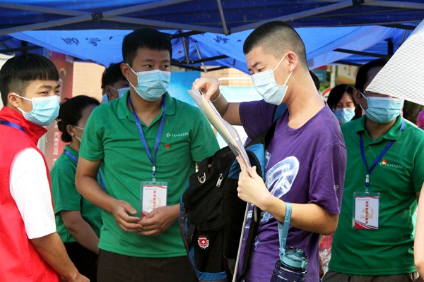 最后一步是能否保證新生順利入學(xué)的關(guān)鍵。一批黨員教師志愿者們在此“恭候”多時,他們組織引導(dǎo)新生按秩序排隊入校,保持好安全距離,佩戴好口罩,提前準(zhǔn)備好錄取通知書和行程碼。因疫情防控需要,新生們也就此與隨行的父母作別,踏入嶄新的學(xué)習(xí)生活環(huán)境。
