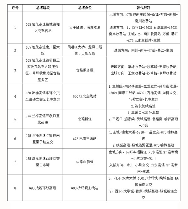 此外,重慶高速集團根據(jù)分析預(yù)測,為保障路網(wǎng)運行平穩(wěn),發(fā)布了易擁堵路段及繞行線路、車流量較大服務(wù)區(qū),提醒出行市民提前規(guī)劃好出行線路。(胡虹、張艷)