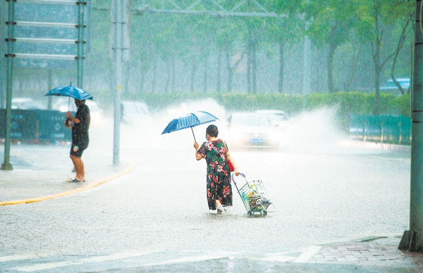 9月16日,江北區(qū)盤溪路延伸段,行人在暴雨中涉水過馬路。當(dāng)日,我市主城突降暴雨,部分路段出現(xiàn)積水情況。記者 崔力 攝/視覺重慶