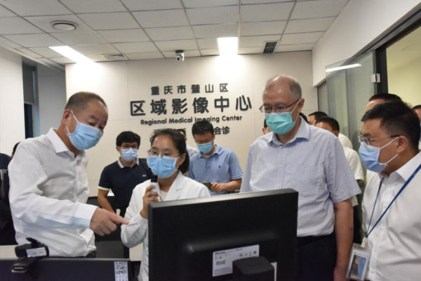 調(diào)研組在璧山區(qū)人民醫(yī)院詳細(xì)了解區(qū)域影像中心運(yùn)行情況并提出意見建議。璧山區(qū)衛(wèi)生健康委供圖