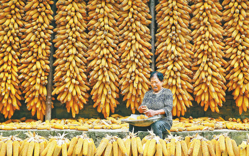 9月14日,黔江區(qū)濯水鎮(zhèn)五福村,村民在院壩晾曬玉米。秋收時節(jié),黔江農(nóng)民把收獲的玉米掛在屋檐下、吊腳樓上進行晾曬,一派豐收景象。