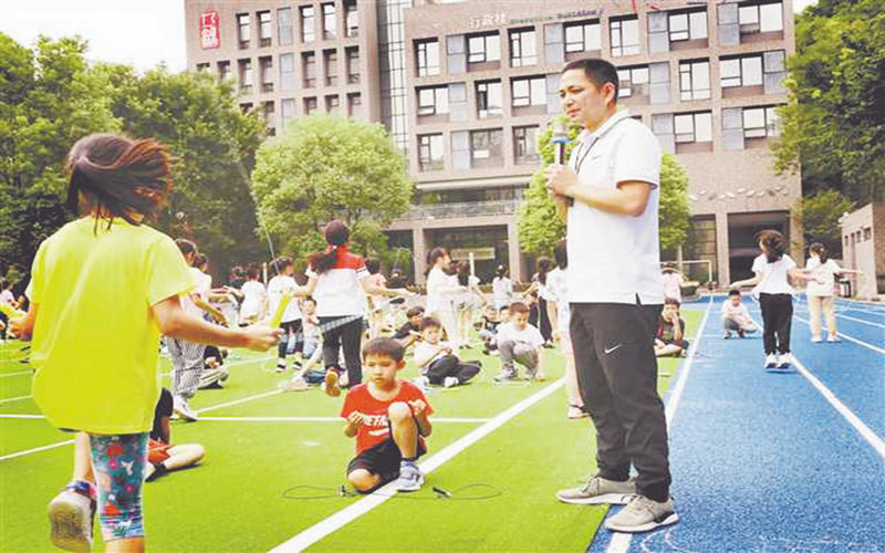 重慶市渝中區(qū)人和街小學體育教師胡甘霖指導學生進行體育鍛煉。