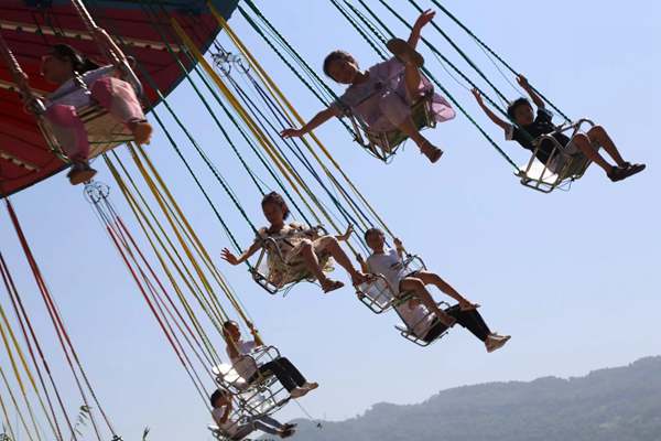 20日,天氣晴好,游客們或在中西合璧的香溪景觀廊橋上拍照打卡,或在網(wǎng)紅S型公路上流連忘返,或爬上雞公山游樂園山頂?shù)歉咄h,在景區(qū)享受愜意的秋日風光。年輕人則在刺激的游樂設施上狂歡,年長的坐索道或摩天輪賞景,尤其是9.99元無限次不限時坐吊椅、吊籃和吊廂三條索道,由于價格低、參與度高,老少咸宜,游客們紛紛拍照或發(fā)短視頻到朋友圈,助推了景區(qū)的人氣上漲。