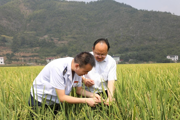 巫山縣天地農(nóng)業(yè)開(kāi)發(fā)有限公司負(fù)責(zé)人李尚前(右一)向稅務(wù)人員介紹水稻長(zhǎng)勢(shì)。甘磊攝