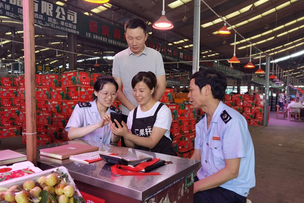 江津區(qū)稅務(wù)人員輔導(dǎo)雙福農(nóng)貿(mào)城商戶使用“農(nóng)品慧”平臺(tái)。聶小淄攝
