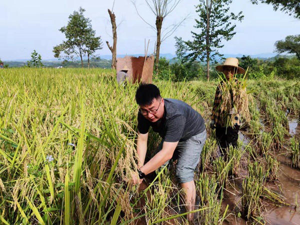 豐都縣稅務(wù)局駐村工作隊(duì)隊(duì)員湛林收割水稻。胡傳平攝
