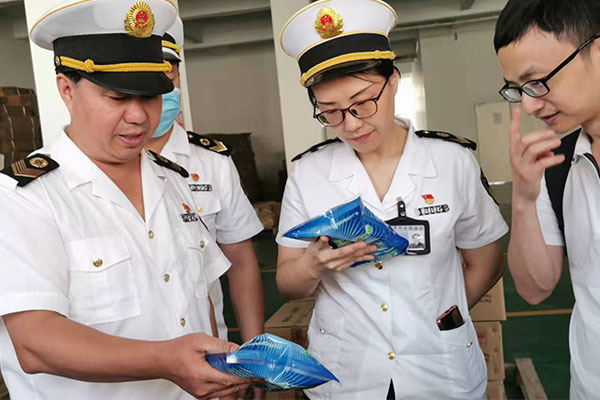 衛(wèi)生監(jiān)督員仔細(xì)查看產(chǎn)品標(biāo)識(shí)。江津區(qū)衛(wèi)生健康綜合行政執(zhí)法支隊(duì)供圖