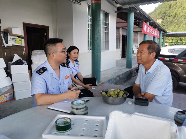 重慶市黔江區(qū)稅務人員向萬慶村青脆李基地負責人龐一平(右一)介紹稅費優(yōu)惠政策。張遠鋒攝