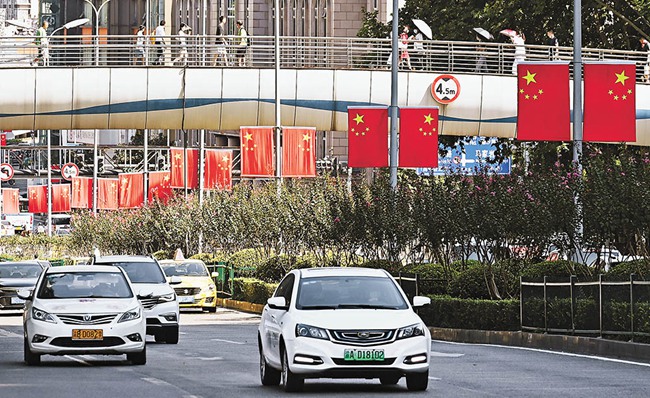 9月26日,沙坪壩區(qū)鳳天大道掛滿鮮艷的五星紅旗。連日來,越來越多的國旗出現(xiàn)在我市街頭、商圈、景區(qū),喜迎國慶的氛圍濃郁。特約攝影 孫凱芳/視覺重慶
