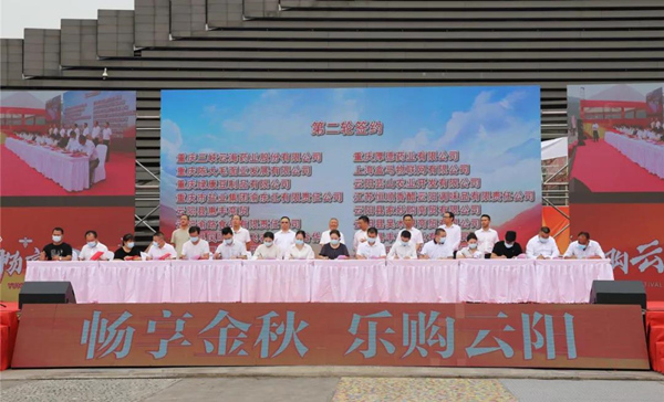 在開幕式上,重慶市軍糧供應中心、印度尼西亞SAK集團、中國銀行、中國石化集團、重慶川維化工有限公司、重慶厚德藥業(yè)有限公司、上海盒馬物聯(lián)網(wǎng)有限公司、重慶舸達裝飾工程有限公司等26家企業(yè)代表與天生云陽品牌管理公司、云陽鑫池農業(yè)公司、泥溪鎮(zhèn)協(xié)和村、泥溪鎮(zhèn)勝利村、三峽云海藥業(yè)股份有限公司、陳大毛面業(yè)發(fā)展有限公司、紅旗水泥有限公司簽訂了各類物資采購合同協(xié)議。