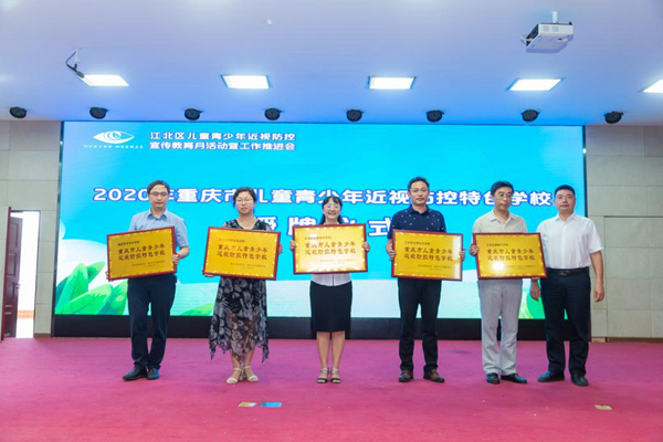 市中小學衛(wèi)生保健所書記唐平授牌“重慶市兒童青少年近視防控特色學!。重慶市眼健康科普基地供圖