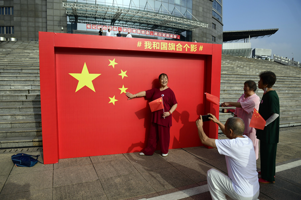 江北的干部群眾紛紛與國旗合影留戀。江北區(qū)委宣傳部供圖