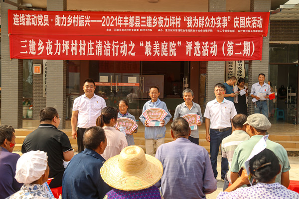 人民網(wǎng)重慶10月1日電 9月27日,一場別開生面的活動在豐都縣三建鄉(xiāng)夜力坪村委廣場舉行。活動由豐都縣三建鄉(xiāng)夜力坪村兩委、駐村工作隊、重慶城市管理職業(yè)學院民政與社會治理學院主辦,社工專業(yè)黨支部、四葉草社會工作服務站承辦;顒硬扇【上線下形式,圍繞“學黨史 我為群眾辦實事”開展,包含“紅色鄉(xiāng)村”“法治鄉(xiāng)村”“美麗鄉(xiāng)村”三個篇章。