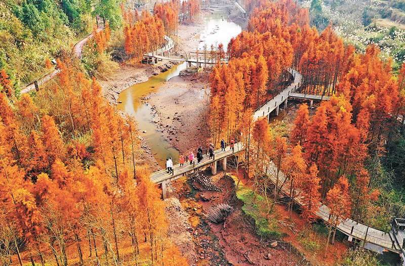 萬(wàn)盛經(jīng)開(kāi)區(qū)青山湖濕地公園,國(guó)家一級(jí)重點(diǎn)保護(hù)野生植物水杉樹(shù)葉變紅,景色宛若油畫(huà)。(資料圖片)特約攝影 曹永龍\視覺(jué)重慶