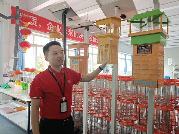 本樂科技負責(zé)人介紹公司研制的一體化智能殺蟲燈。李金攝