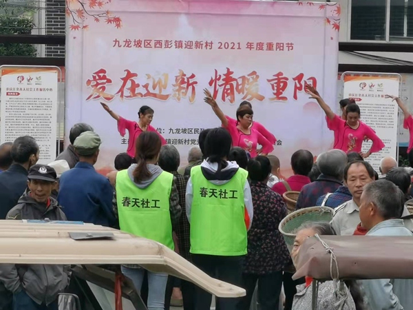 在九龍坡區(qū)西彭鎮(zhèn)上腰鼓《活力中國》、舞蹈《天南地北唱中華》和合唱《沒有共產(chǎn)黨就沒有新中國》熱鬧了迎新村便民服務(wù)中心。重慶江北春天社會工作服務(wù)中心聯(lián)合迎新村村委會開展的敬老活動為當(dāng)?shù)氐睦先藗兯腿チ斯?jié)日的祝福。為村內(nèi)老人送上米、油、銀齡包等慰問品,并對村內(nèi)孤寡老人進行入戶慰問,為村內(nèi)老人送上真切的問候。