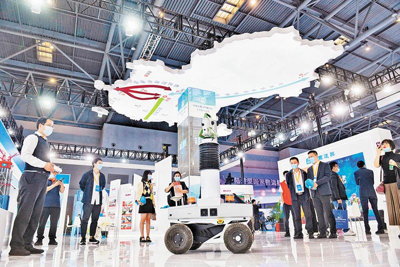 10月13日,2021中國西部(重慶)國際物流博覽會現(xiàn)場,中建鐵投集團自主研發(fā)的移動式高精度測量機器人吸引了不少參展商的關(guān)注。 記者 羅斌 攝/視覺重慶