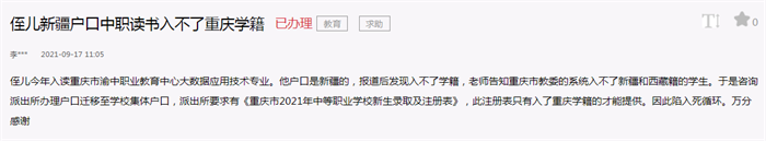 9月17日,李女士在首次留言中說(shuō)到:侄兒今年入讀重慶市渝中職業(yè)教育中心大數(shù)據(jù)應(yīng)用技術(shù)專業(yè),由于戶口在新疆,去該校報(bào)道后發(fā)現(xiàn)入不了學(xué)籍。于是咨詢派出所辦理戶口遷移至學(xué)校集體戶口,派出所要求提供《重慶市2021年中等職業(yè)學(xué)校新生錄取及注冊(cè)表》,然而,該注冊(cè)表只有入了重慶學(xué)籍的才能提供。因此陷入死循環(huán)……