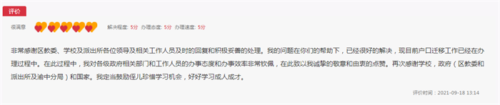 - “非常感謝渝中區(qū)教委、學(xué)校及派出所相關(guān)工作人員及時(shí)的回復(fù)和妥善處理。侄兒已順利入讀重慶學(xué)校,戶口也在遷移辦理中了!”…