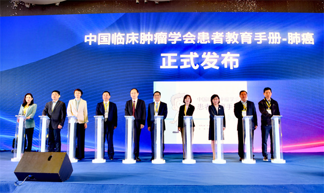 參會專家在年會上一同發(fā)布《患者教育手冊·肺癌》。曾理/攝