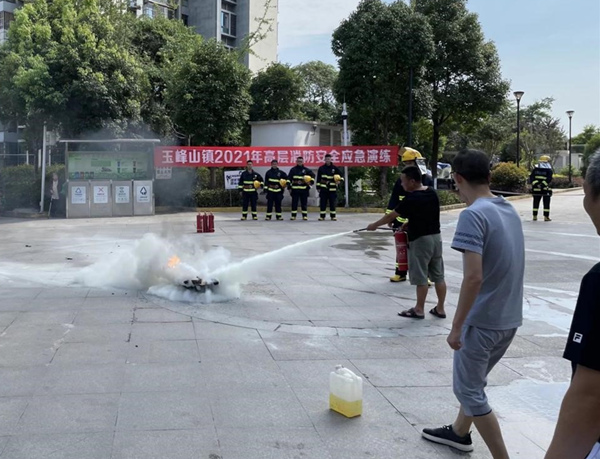 應(yīng)急隊(duì)員教居民正確使用滅火器。玉峰山鎮(zhèn)供圖