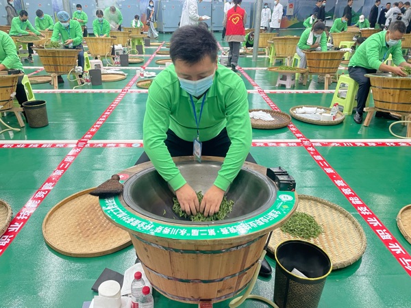 殺青、揉捻、做形、烘干……比賽現(xiàn)場,選手們聚精會神,使用來自永川的鮮茶葉為原材料,根據(jù)自己的思考制作出不同形狀、不同口感的茶葉。