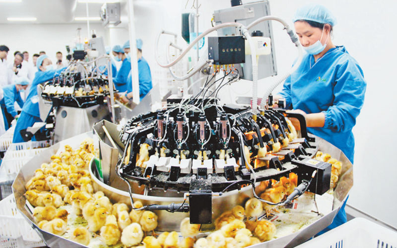 華裕農(nóng)科工作人員正在對雞苗進(jìn)行斷喙。(受訪者供圖)