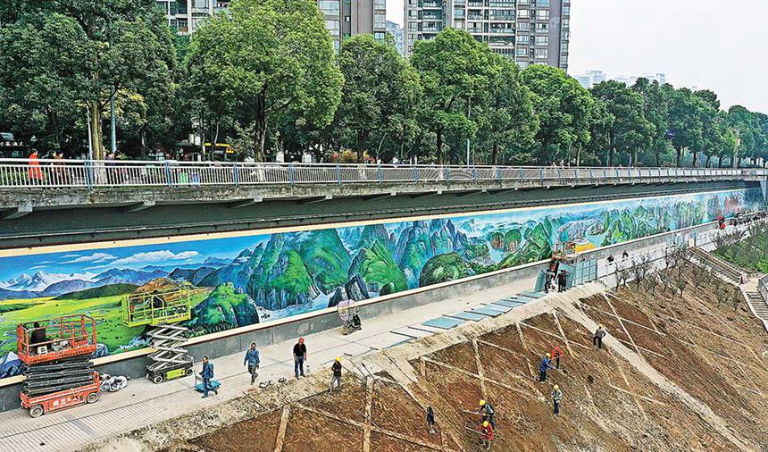 10月25日,南岸南濱路雅巴洞江岸,“長(zhǎng)江生態(tài)人文畫(huà)卷”正在繪制中。這是兩江四岸品質(zhì)提升工程的一部分,該油畫(huà)長(zhǎng)300多米、高5米,內(nèi)容包括長(zhǎng)江源頭、重慶兩江四岸、石寶寨、白帝城、巫峽紅葉、黃鶴樓、黃山、蘇州園林等長(zhǎng)江流域景點(diǎn),將在兩個(gè)月后全部完成。特約攝影 鐘志兵/視覺(jué)重慶