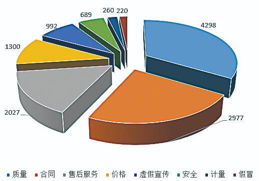 據(jù)悉,今年前三季度按投訴性質(zhì)分類,質(zhì)量問題4298件,占投訴總量的24.96%;合同問題2977件,占17.29%;售后服務(wù)問題2027件,占11.77%;價(jià)格問題1300件,占7.55%;虛假宣傳問題992件,占5.76%;安全問題689件,占4.00%;計(jì)量問題160件,占1.50%;假冒問題220件,占1.28%;人格尊嚴(yán)問題86件,占0.5%;其他問題4372件,占25.39%。