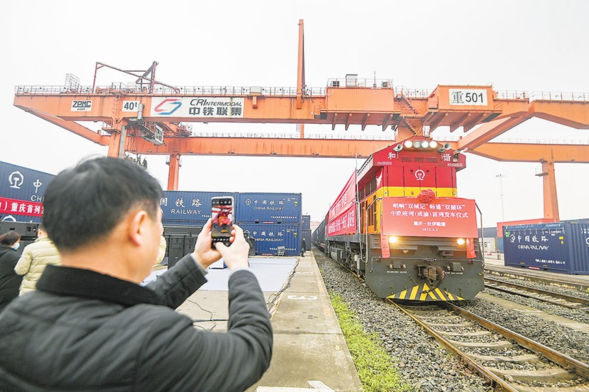 二○二一年一月一日,重慶團結(jié)村中心站,重慶、成都兩地同時發(fā)出二○二一年中歐班列(成渝)號第一趟列車。記者 龍帆 攝\視覺重慶