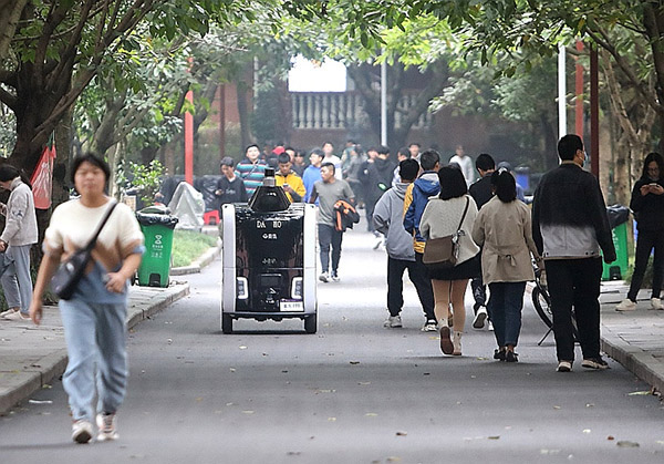 無人快遞車正在校內(nèi)投件。 記者 羅斌 攝