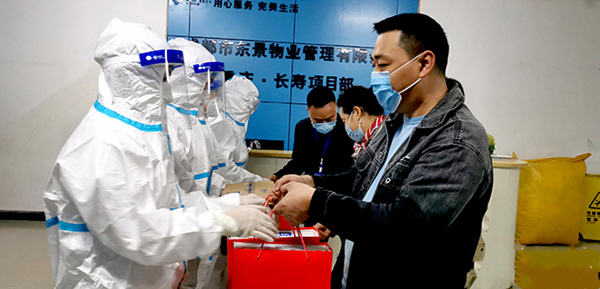 志愿者為醫(yī)護人員送去“愛心”。駱英攝