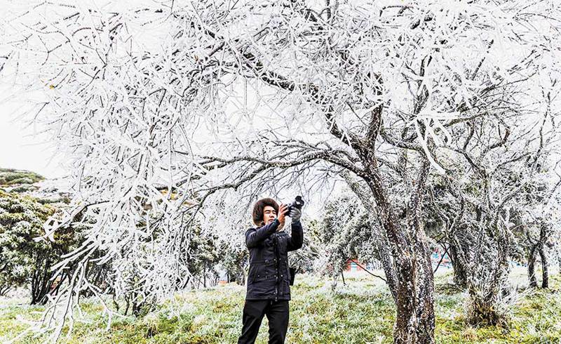 圖為攝影愛好者在南川區(qū)金佛山景區(qū)拍攝霧凇。