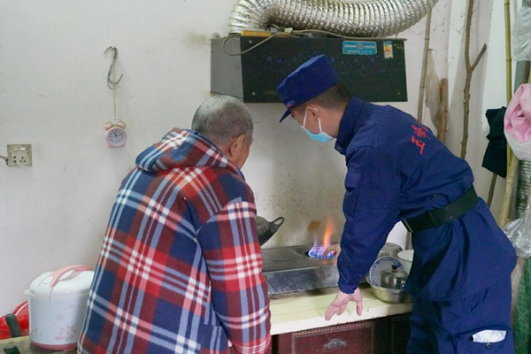 該應(yīng)急隊了解到轄區(qū)有幾名老人處于失明或半失明狀態(tài),又沒有子女,于是主動上門幫他們詳細(xì)排查家中消防安全隱患。在段大爺家中,應(yīng)急隊隊員看到未規(guī)范使用的線路插座,幫他做了漏電處理,同時檢查屋內(nèi)天然氣的使用情況,仔細(xì)檢查燃?xì)夤艿篮徒宇^處,以及灶具等是否存在燃?xì)庑孤兜碾[患,并現(xiàn)場普及如何判斷燃?xì)馐褂檬欠癜踩?/p>
