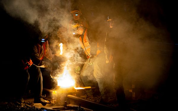 人民網(wǎng)重慶11月15日電 11月14日凌晨2點,由中鐵十一局集團承建的萬州北站改造工程現(xiàn)場燈火通明,300多鐵路工人齊心協(xié)力,用劃龍舟的方式,將最后一組道岔推到指定位置。