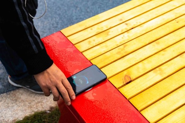 除此之外,公園內各類智慧設施也是隨處可見,比如可充電、可上網(wǎng)的智慧座椅。市民可以直接通過USB接口為手機充電。如果沒帶數(shù)據(jù)線也沒關系,座椅兩端還有無線充電板,手機放在上面就可以直接充電。