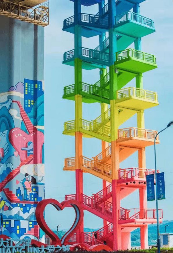 據(jù)了解,“津彩云梯”這座有著7種顏色的天梯是江津愛情文化長廊標(biāo)志性建筑物。為提升城市品質(zhì),彰顯“四面山水?人文江津”的城市形象,整個(gè)長廊以江津特色文化中的“愛情文化”為設(shè)計(jì)主題,依托發(fā)生在江津的“愛情天梯”故事,從江津浪漫之城立意的三個(gè)維度進(jìn)行濱江主題策劃和文化氛圍提升。